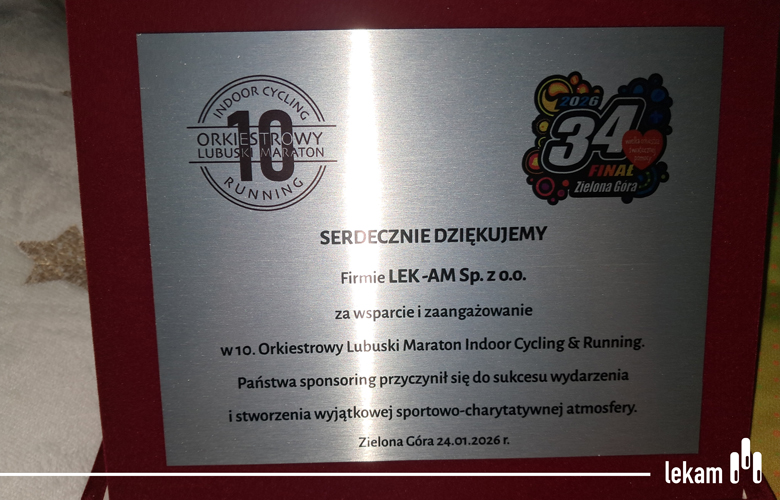24 stycznia w hali Centrum Rekreacyjno-Sportowego w Zielonej Górze odbył się X Orkiestrowy Lubuski Maraton Indoor Cycling & Running. Po 5 godzinach intensywnych zmagań uczestnicy mogli wspólnie cieszyć się z rekordowego wyniku zbiórki. W tym roku w Lubuskim Maratonie wzięło udział blisko 300 uczestników, w tym 200 rowerzystów i 100 biegaczy. Wspierając wydarzenie LEK-AM przygotował dla sportowców pakiety startowe. Dzięki zaangażowaniu naszej Przedstawicielki Medycznej kolejny raz firma była obecna na finale WOŚP w Zielonej Górze. Wyrazy uznania składamy wszystkim uczestnikom zbiórki na rzecz zapewnienia najwyższych standardów diagnostyki i leczenia chorób przewodu pokarmowego u najmłodszych dzieci.