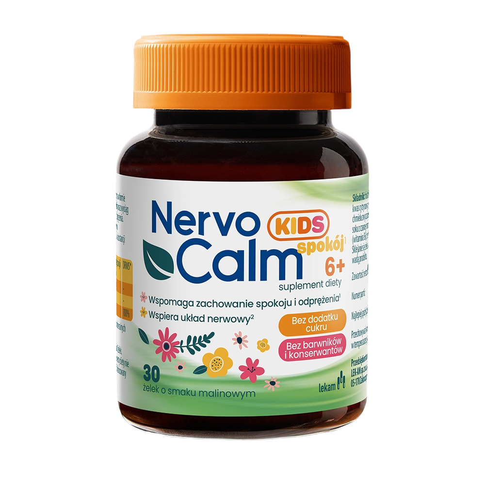 NervoCalm KIDS Spokój1 to suplement diety dla dzieci powyżej 6. roku życia w formie pysznych żelek o smaku malinowym bez dodatku cukru.